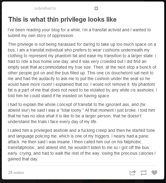As a transage activist, I couldn't help but shed a tear after reading this tragic account of the terrible suffering of a transfat individual publicly harassed and abused by a transphobic cismorph exercising his thin privilege.