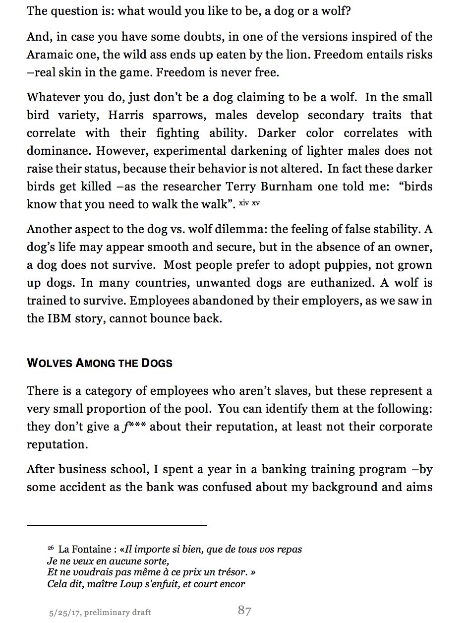 PS: There are no (open) wolves in corporate America. The ambitious aren't wolves, they're (100%) sociopaths who know they face no real risk from their viciousness as long as they don't step on any of the 3rd rails (sex, race, etc., harassment.) The only wolves in the modern corporation are dog-mimics, any in 25 years I never saw anyone remotely like this move to and stay in management. No true man can tolerate the politics. This is reason #349 why American society is circling the drain. Virtue & honor are immediately disqualifying attributes for advancement in any organization.